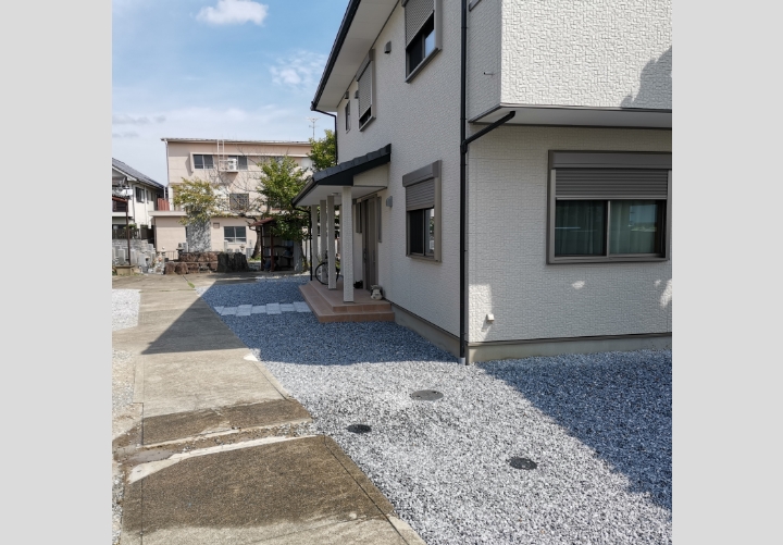 新築お庫裏の石張り玄関アプローチ、外部雑草防止の防草シート&砂利敷きを行いました。防犯効果もありますし、コスパも良いのでおすすめです。
