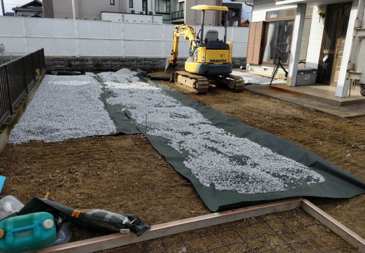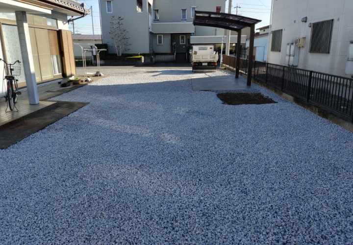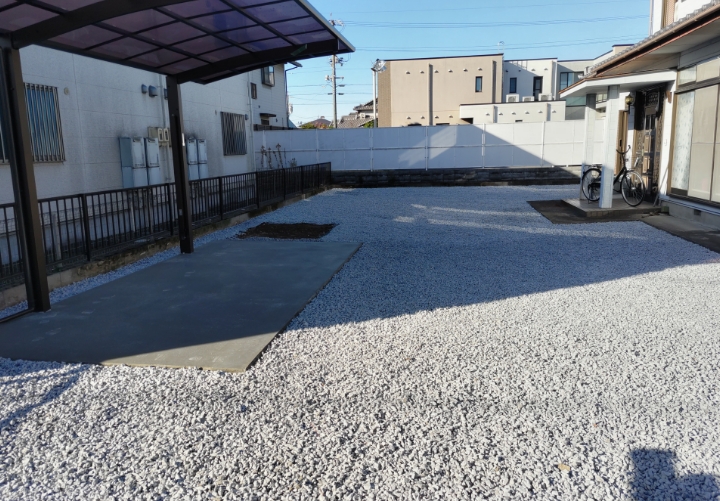 広いお庭を撤去して防草シート、砂利敷きとカーポートを設置しました。