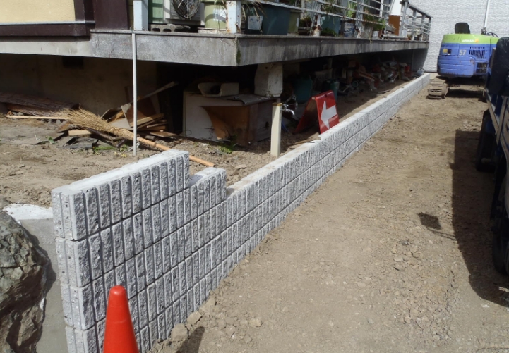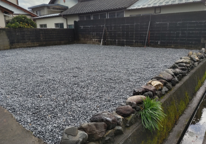 庭を撤去して駐車場にします。土留めブロック積み、道路面は砂利流出防止の為、帯状に土間コンクリートを打設しました。