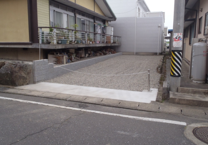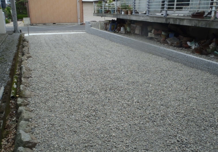 庭を撤去して駐車場にします。土留めブロック積み、道路面は砂利流出防止の為、 帯状に土間コンクリートを打設しました。
